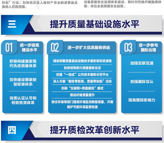 从全国质检工作会议上获悉:2018年,国家质检总局将着力开展“质量提升行动年”活动,从增加农产品、食品药品优质供给,促进消费品提质升级,提升装备制造竞争力,提升原材料供给水平,提升建设工程质量水平,推动服务业提质增效,提升社会治理和公共服务水平,加快对外贸易优化升级等8个方面,集中力量开展3年质量提升行动。