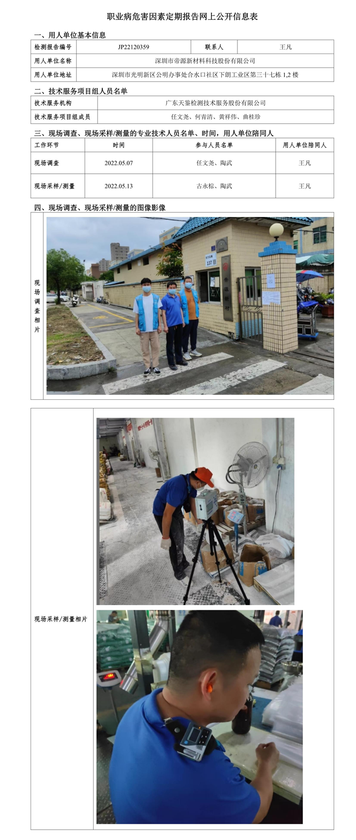 JP22120359 深圳市帝源新材料科技股份有限公司职业病危害因素定期报告网上公开信息表
