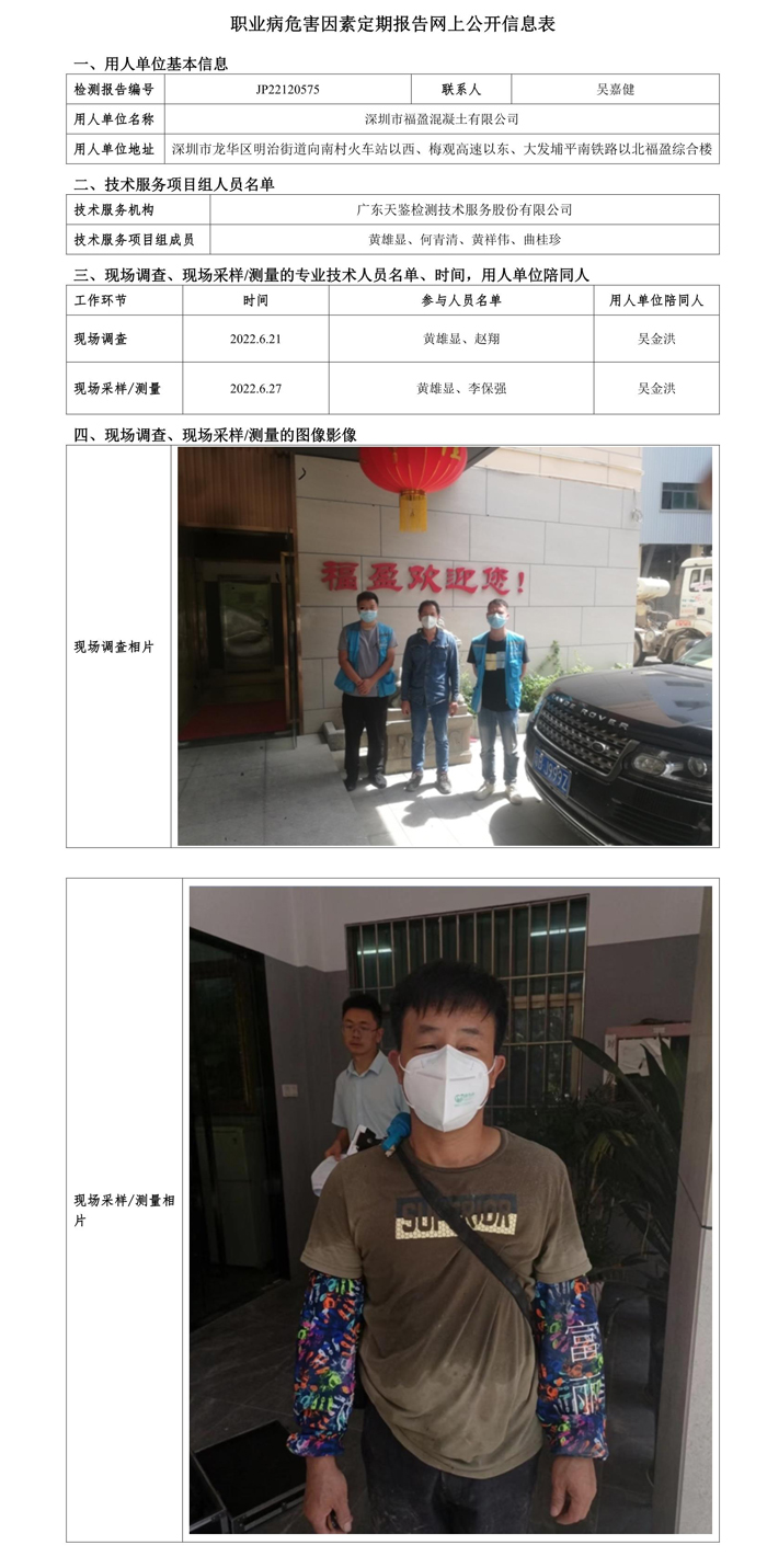 JP22120575深圳市福盈混凝土有限公司职业病危害因素定期报告网上公开信息表