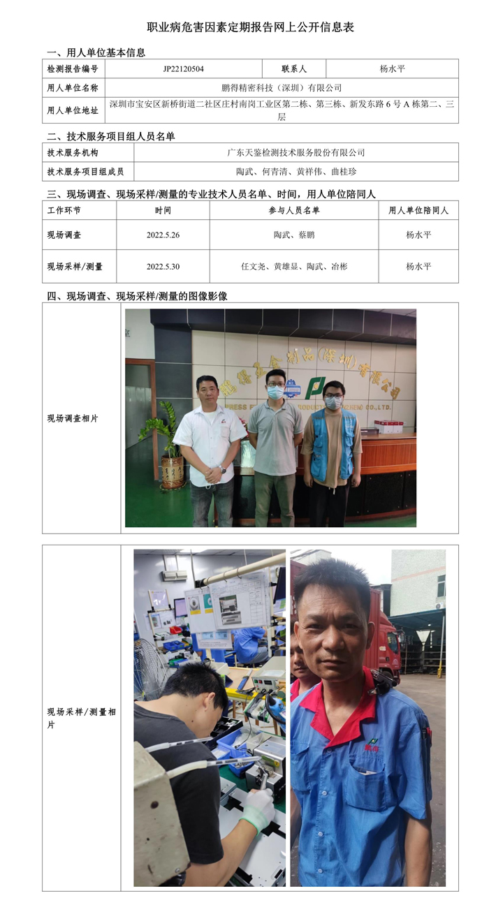 JP22120504鹏得精密科技圳限公司职业病危害因素定期报告网上公开信息表